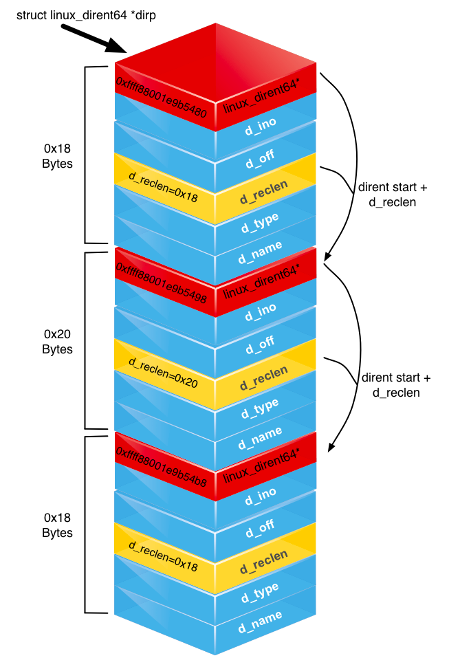 getdents64 is not an array of equally sized structures. This supports a file name that can be from 1 to 255 bytes long. As such, a linux_dirent64 struct describes its real size in its d_reclen field. This enables you to use it as a byte offset when jumping to the next entry in the buffer. The attached diagram helps to visualise this.dirp, is memory allocated by the caller in user space. You should not directly manipulate user-space memory, as this runs the risk of causing a kernel oops—functions such as copy_from_user and copy_to_user allow you to copy bytes safely to a kernel-space buffer that you create using kmalloc.kfree any kernel memory you allocate to your rootkit!